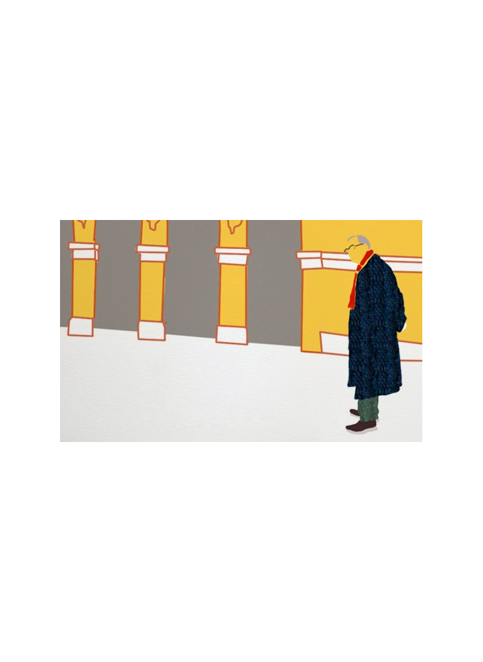 En esta ilustración de Bilbao apreciamos a uno de los clásicos habitantes de la ciudad, que aunque bien puede parecer ilustre, es el arquetipo de personaje bien puesto frente al Teatro Arriaga.