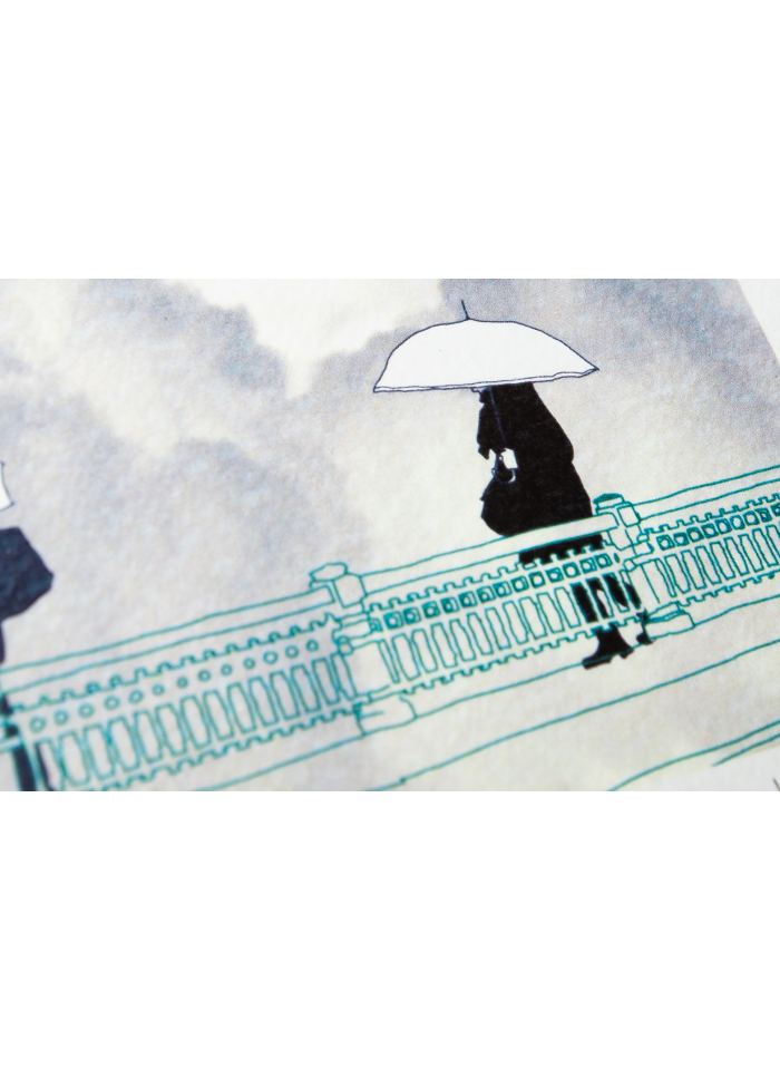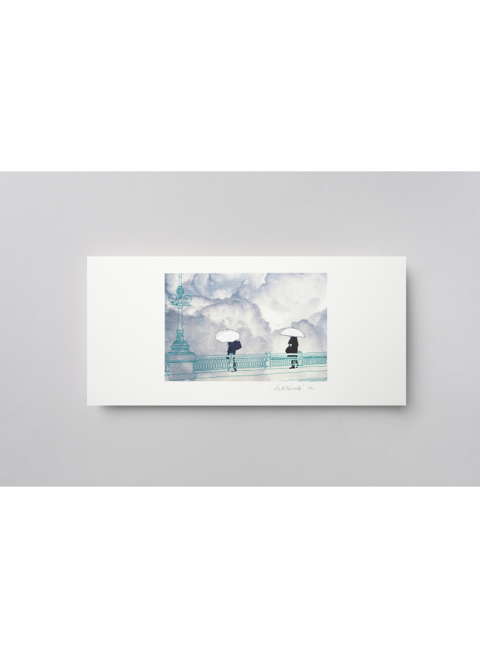 Lámina del puente del Kursaal en día lluvioso realizada mediante técnica mixta. El paraguas es un utensilio imprescindible para los donostiarras; así, ante los inesperados chubascos, la lluvia nos sorprenderá preparados. En el puente del Kursaal, a la lluvia se añade también el viento, y no es fácil pasar el puente sin que el paraguas dé la vuelta.
