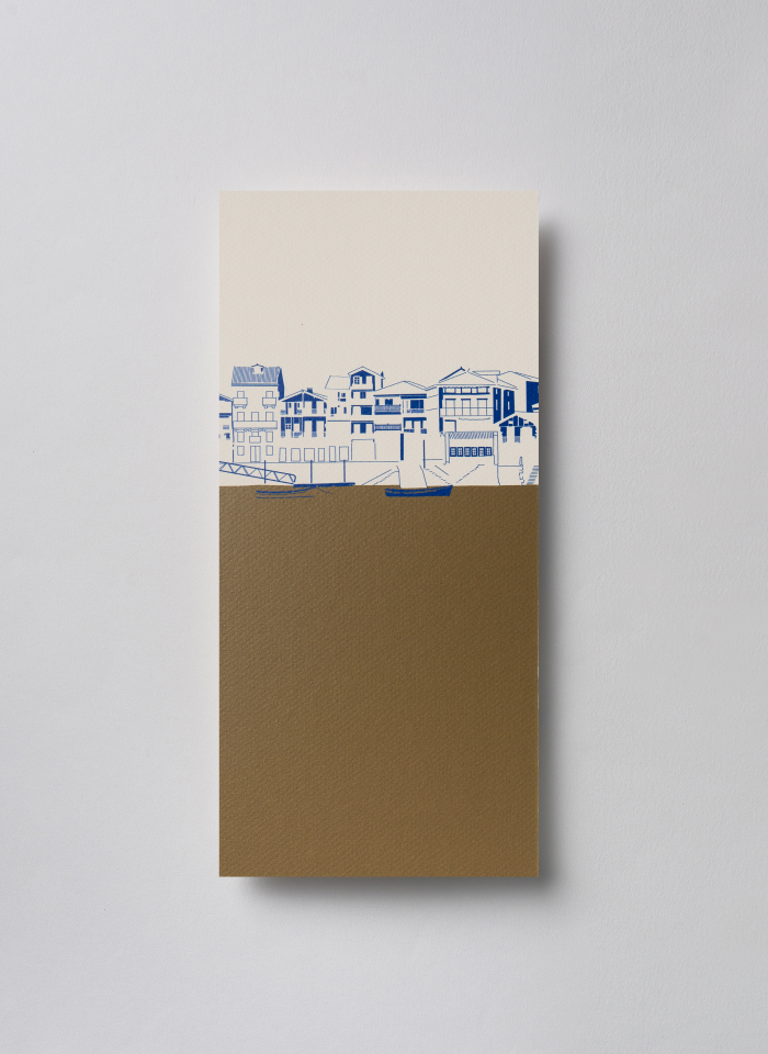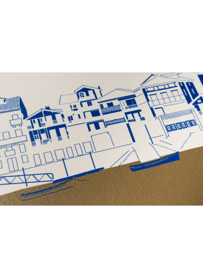 Esta ilustración de Pasajes San Juan, en Gipuzkoa, evoca un pueblo de ensueño. Con tonos de aceituna, azul y blanco, esta ilustración captura la serenidad y la belleza de esta localidad costera. Ahí encontraremos la icónica “motora” que une las dos orillas de San Pedro y San Juan. Albaola, el centro de construcción de embarcaciones históricas, es también un elemento destacado. Esta ilustración de Pasajes San Juan rinde homenaje a la rica tradición marítima y la tranquilidad de este encantador rincón de Gipuzkoa.