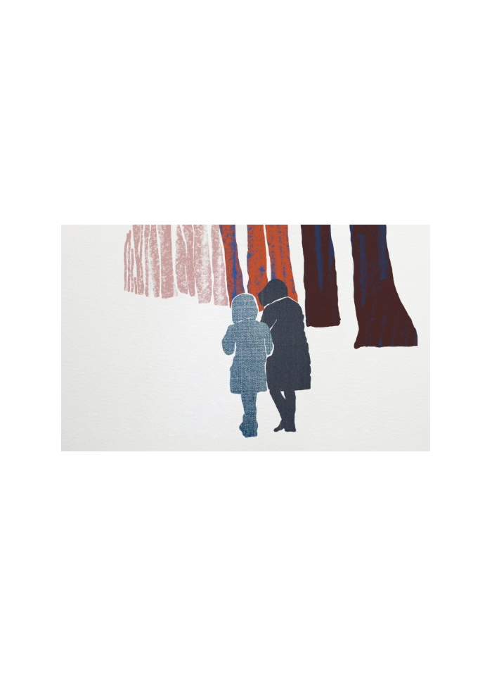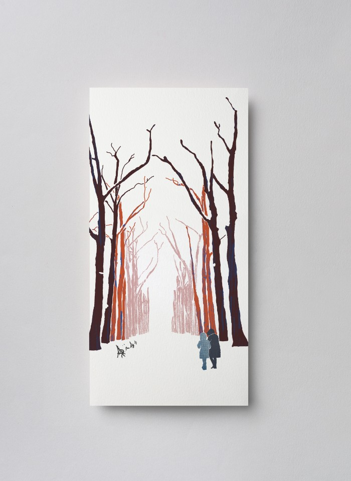 La ilustración Paseo Cervantes de la serie "Gasteiz" nos muestra dos personas adentrándose en el célebre parque de La Florida, o La Senda como es más conocido por los autóctonos. El espacio blanco de la nieve evoca serenidad y silencio, y su composición nos dirige hacia un destino central donde la nada la construyes tu.